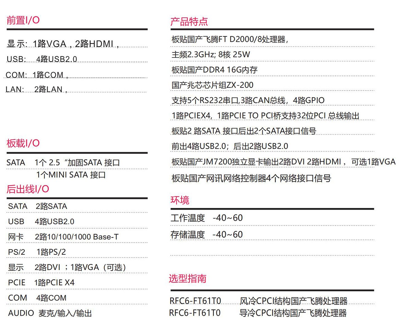 采用國產飛騰處理器FTD2000/8+ZX-200芯片組按 國產100%設計,6U CPCI規格。具備豐富的外圍接口;設計了高效的散熱系統,可顯著提高處理器的浮點運算性能,以太網、PCIE、支持高帶寬數據傳輸, 滿足視頻采集與處理、雷達和聲吶等應用對高速數據傳輸的要求。專為惡劣環境使用而設計,滿足無人機、裝甲車、水面艦艇等軍工領域。