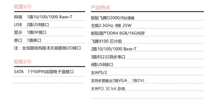 板貼飛騰D2000/8處理器,CompactPCI 3U架構,具備豐富的外圍接口;設計了高效的散熱系統,可顯著提高處理器的浮點運算性能,以太網、PCIe TO PCI擴展總線、滿足視頻采集與處理等應用對高速數據傳輸的要求。專為惡劣環境使用而設計,滿足無人機、裝甲車、水面艦艇等應用需求。